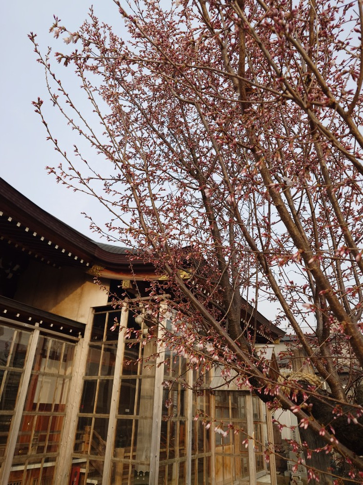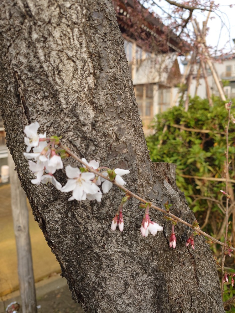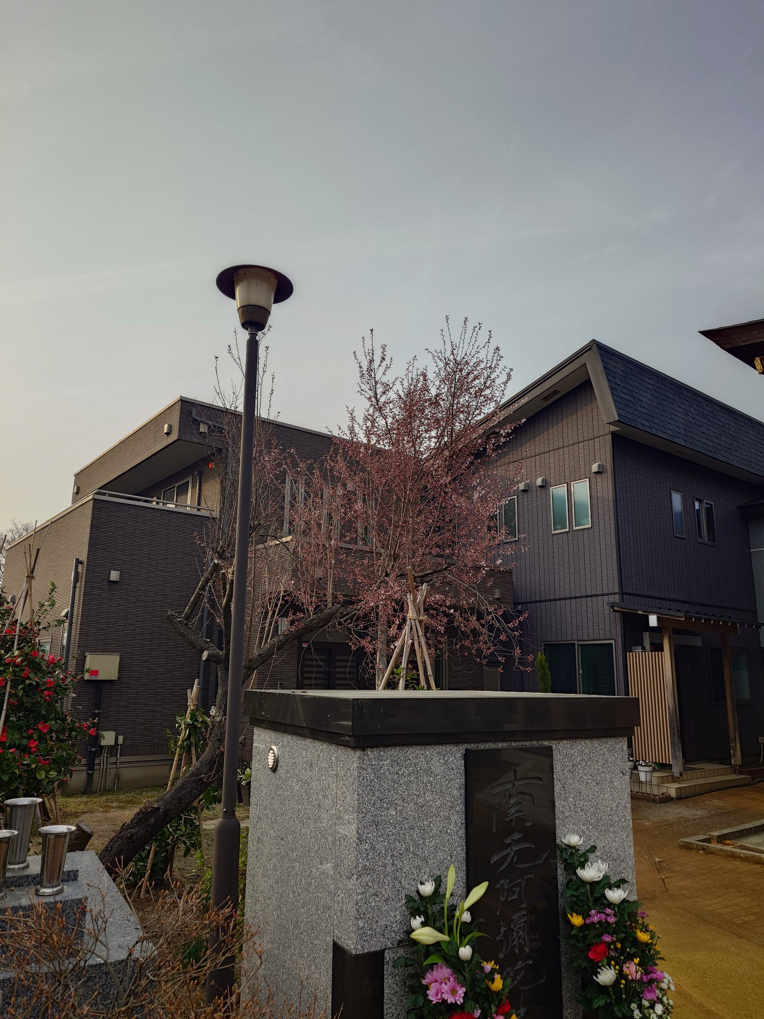 さて、本日善行寺境内にある桜が咲きました。永代供養墓の後ろに、ひっそりと咲いているではありませんか。